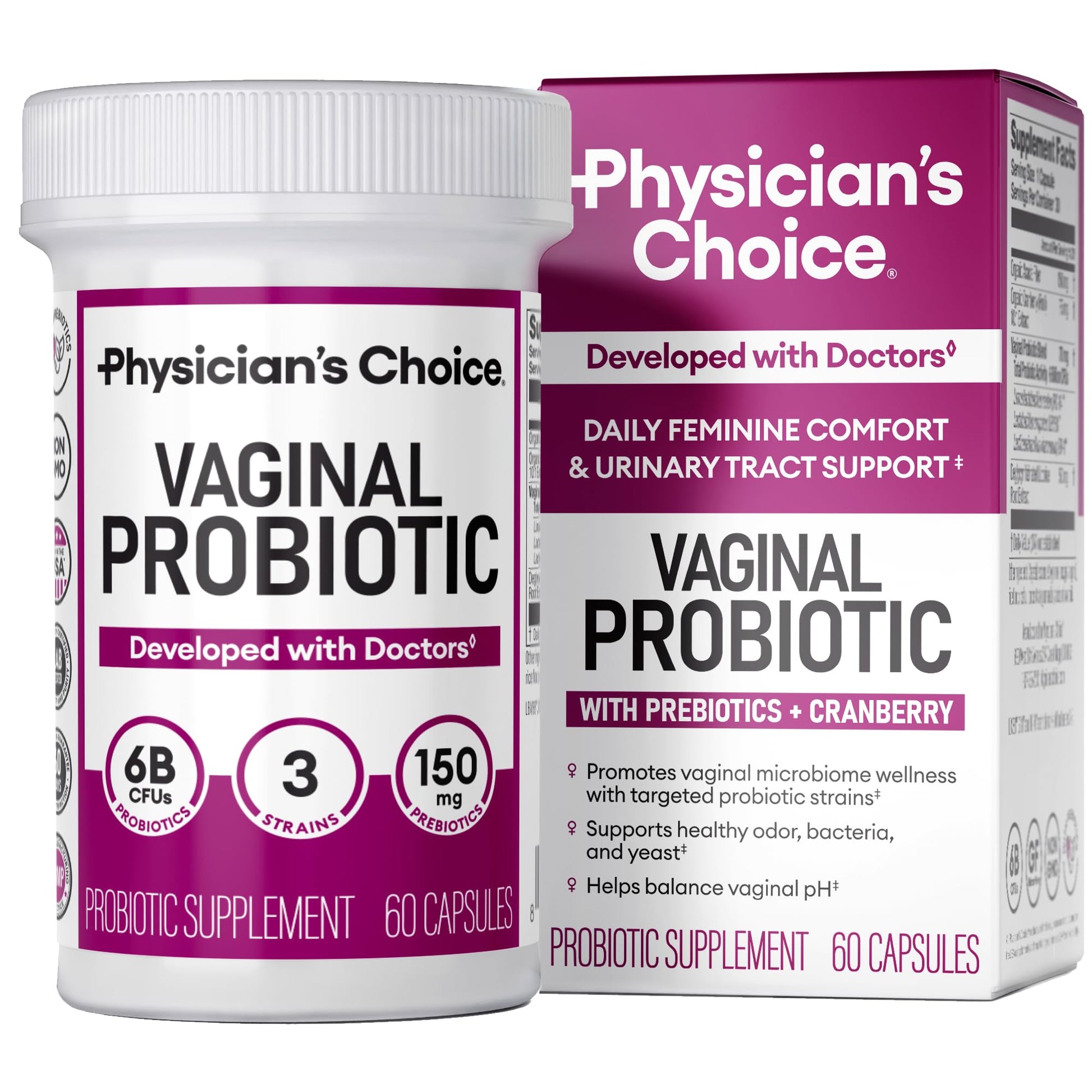 - Probióticos clínicamente estudiados para la salud vaginal: el probiótico vaginal Physician's Choice para mujeres está formulado con tres cepas probióticas clínicamente estudiadas para promover un equilibrio saludable del pH, el control del olor vaginal, el equilibrio de levaduras y promover la humedad vaginal natural, ayudándote a sentirte cómoda y segura todos los días. El mismo gran producto que te gusta, con un nuevo aspecto. El embalaje puede variar